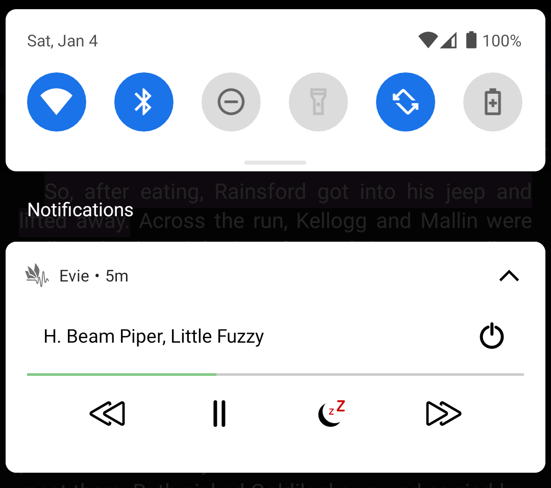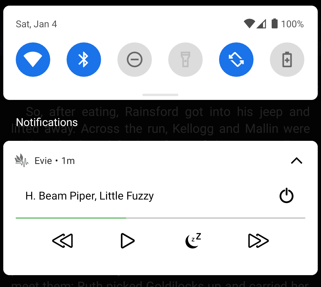 Evie will also display the Book Author, Book title and the Current Chapter on your Bluetooth device, if your device supports that. If your device has a way to display the progress of what’s being played, the progress bar will tell you how far along you are in the current chapter.