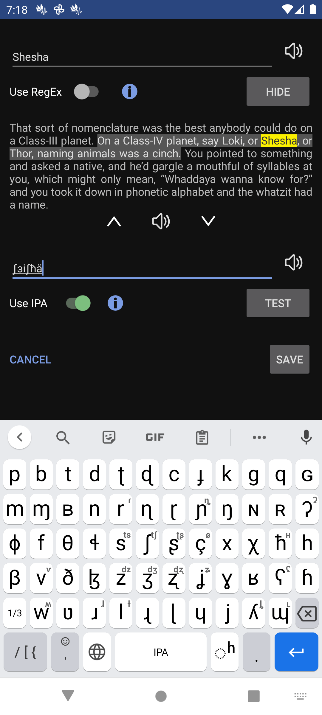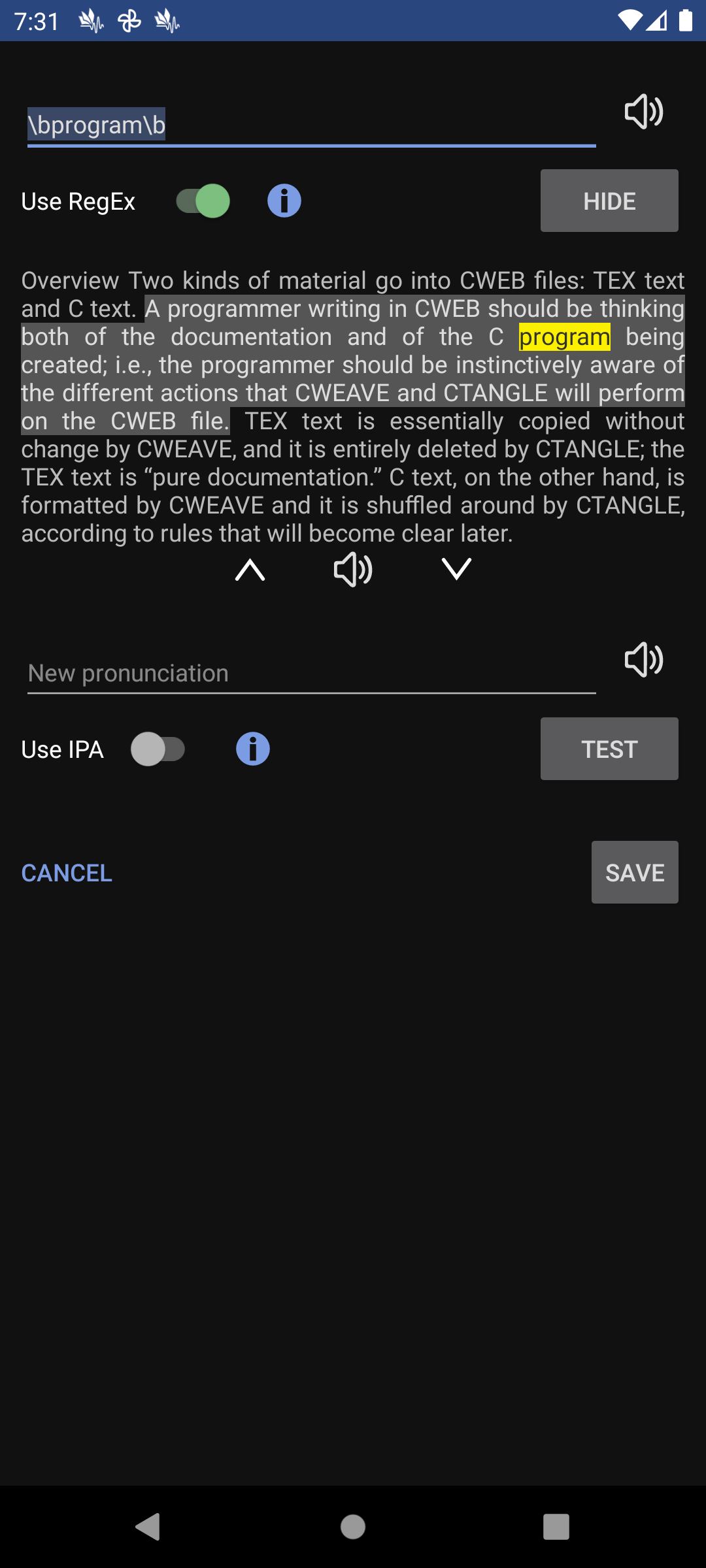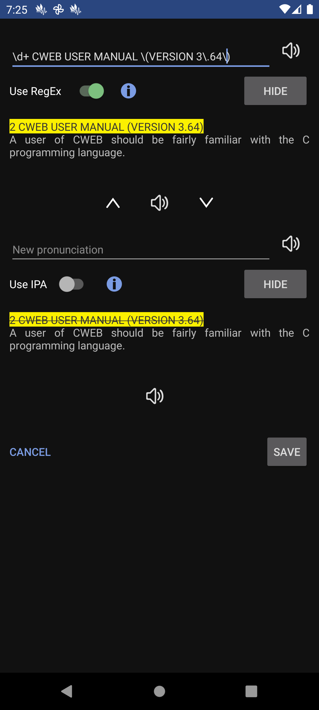 The Pronunciation editor allows you to teak the way that the text is pronounced or even to silence out text. You can replace multiple words if you want or even entire sentences. You can optionally use regex to match the text to be replaced, and you can optionally use IPA to specify how the replacement should sound.